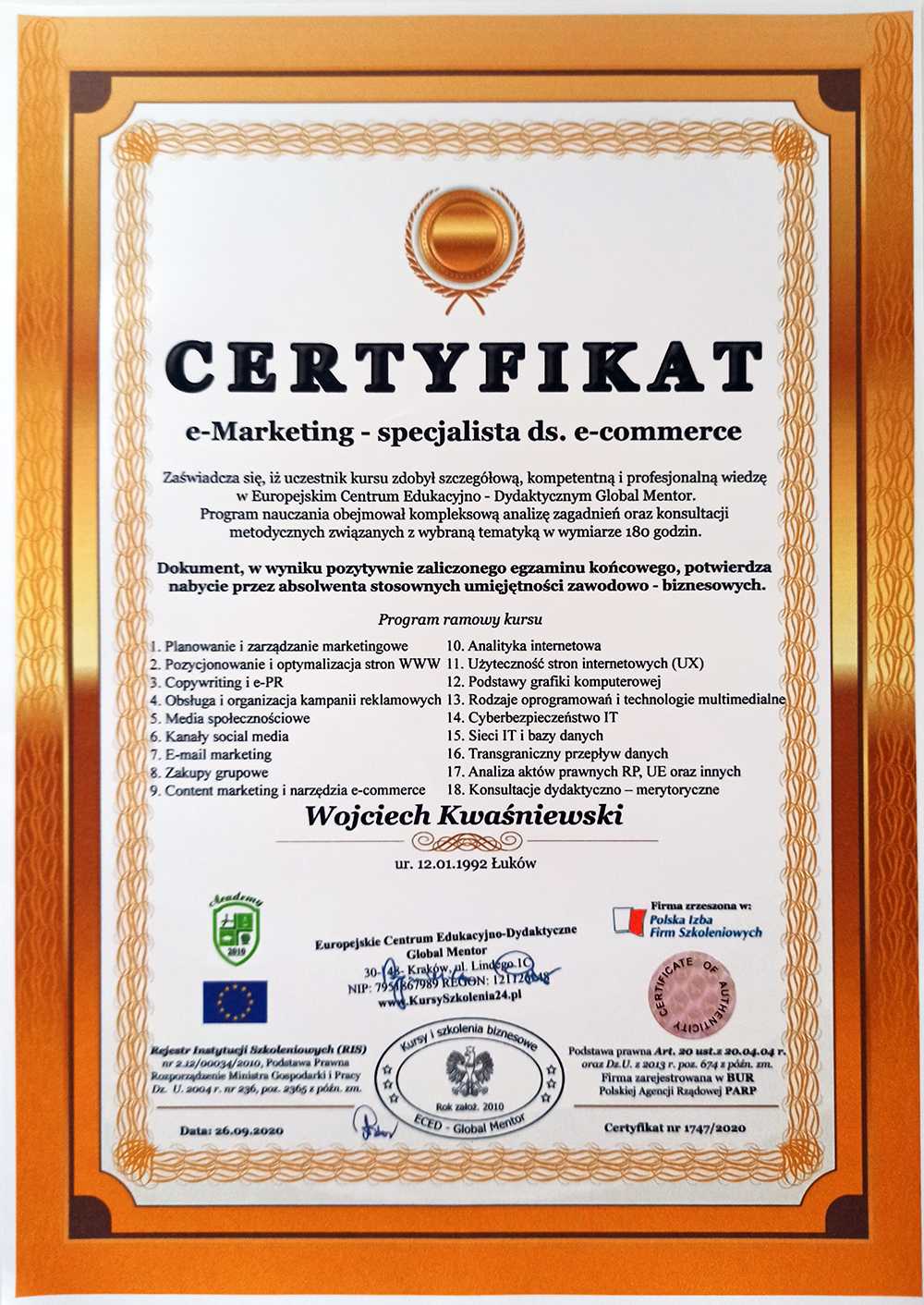 Moje ponad 12 letnie doświadczenie jest poparte wieloma certyfikatami co gwarantuje najwyższą jakość usług.